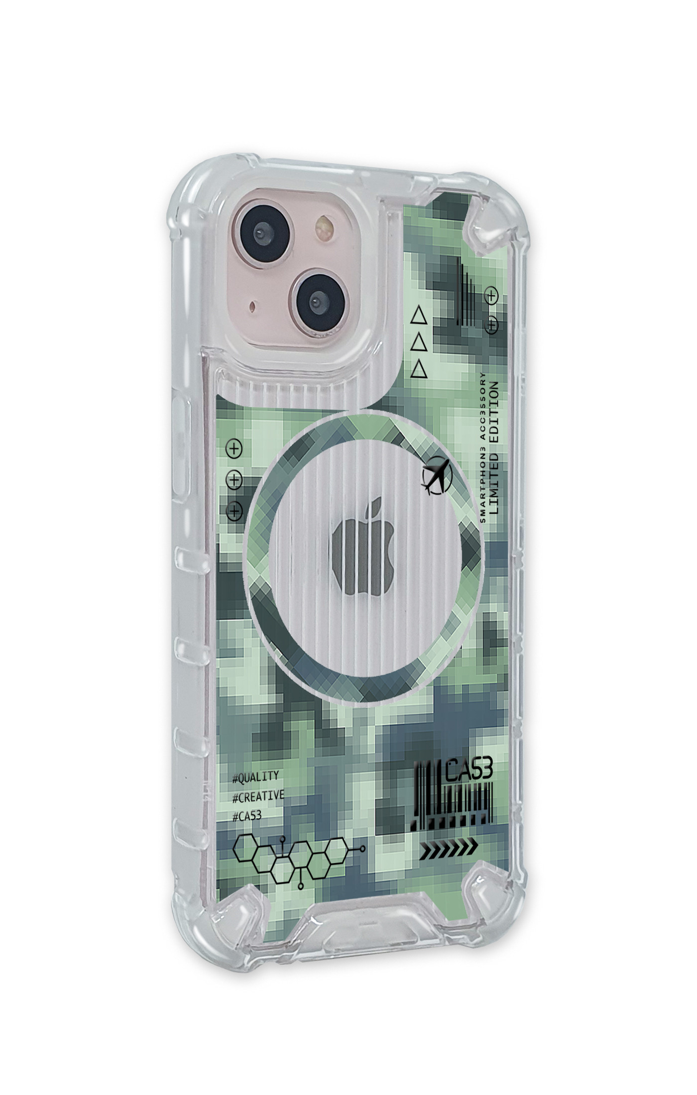 La stampa in trasparenza è particolarmente indicata per i telefoni chiari. Il motivo magsafe stampato è soltanto un effetto grafico, un gioco di trasparenze studiato per risaltare la texture rigata del back e per lasciare scoperta la Mela.